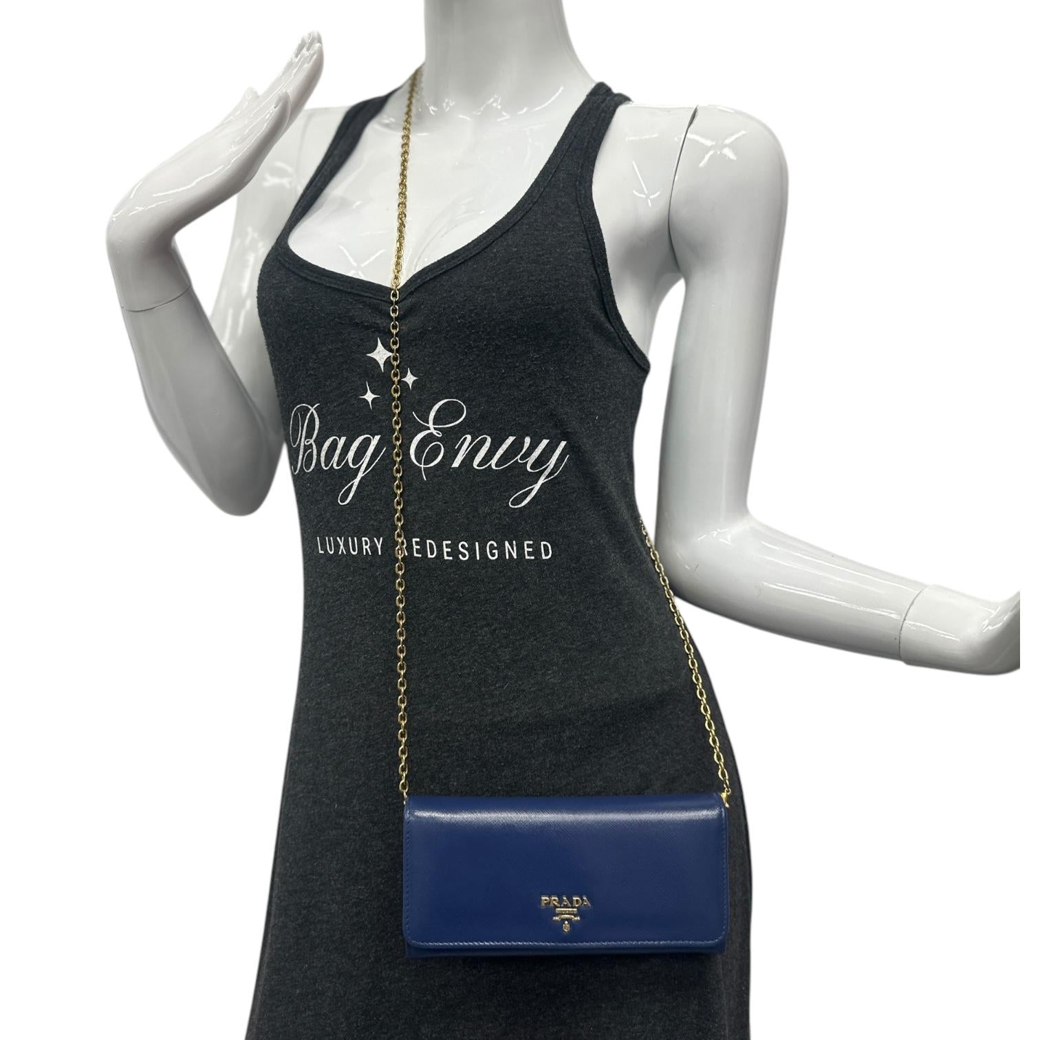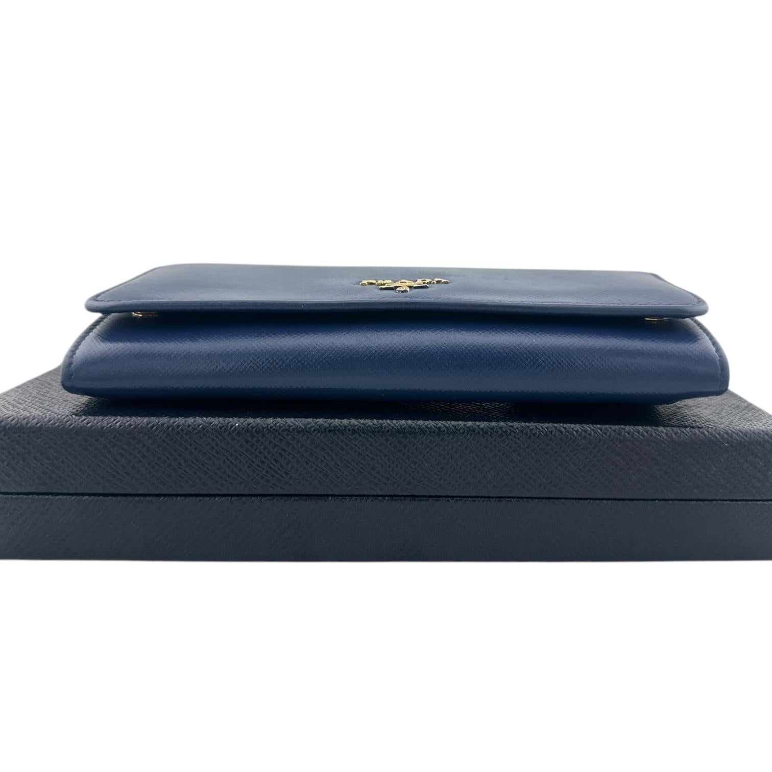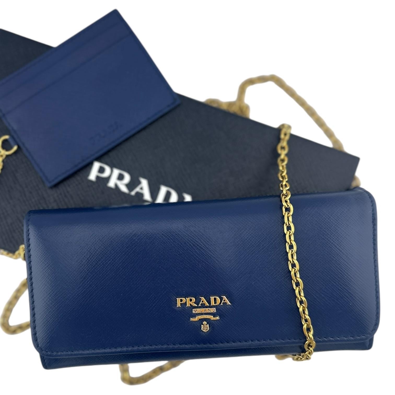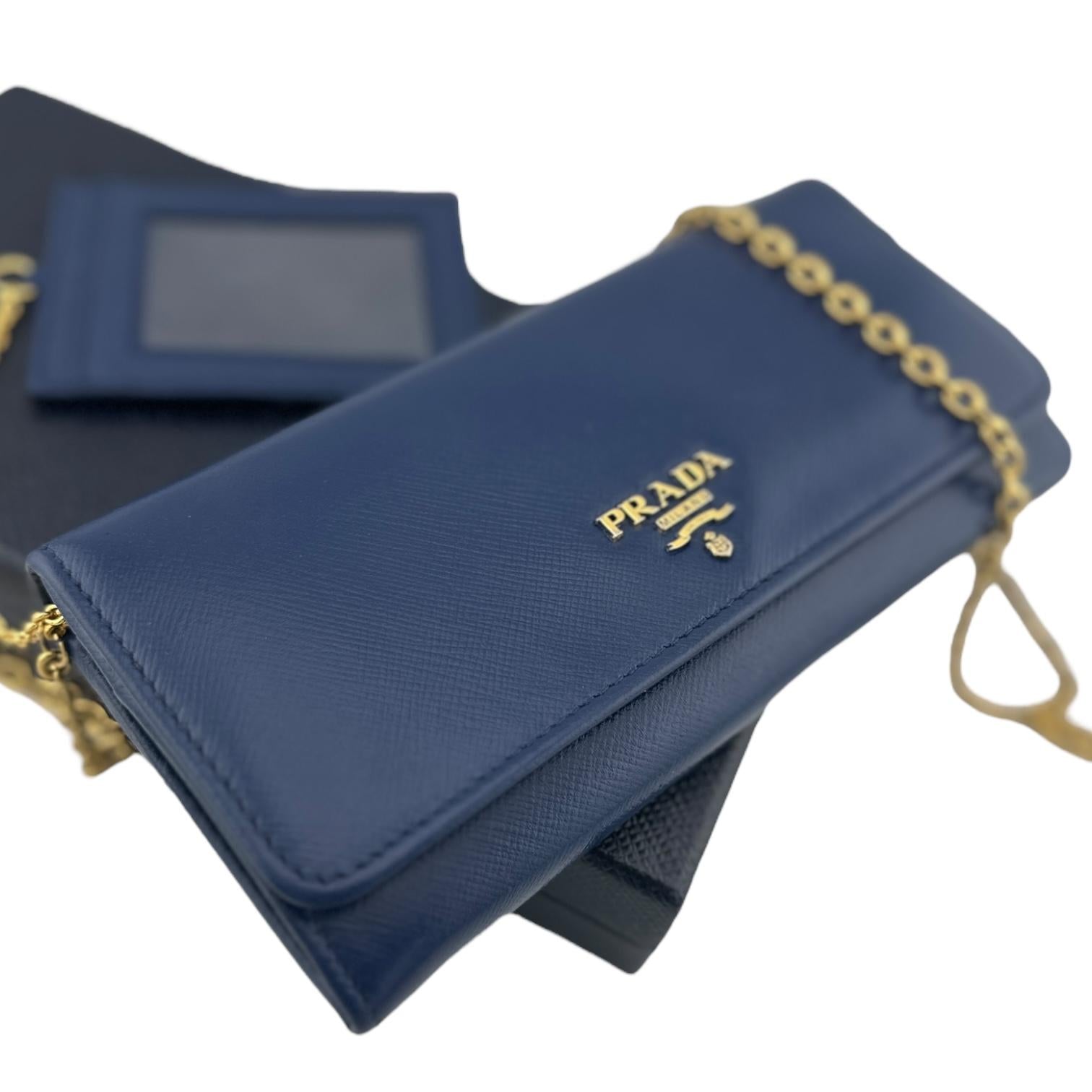 PRADA Indigo Saffiano Leather Wallet/Card Holder with added Gold Crossbody Chain