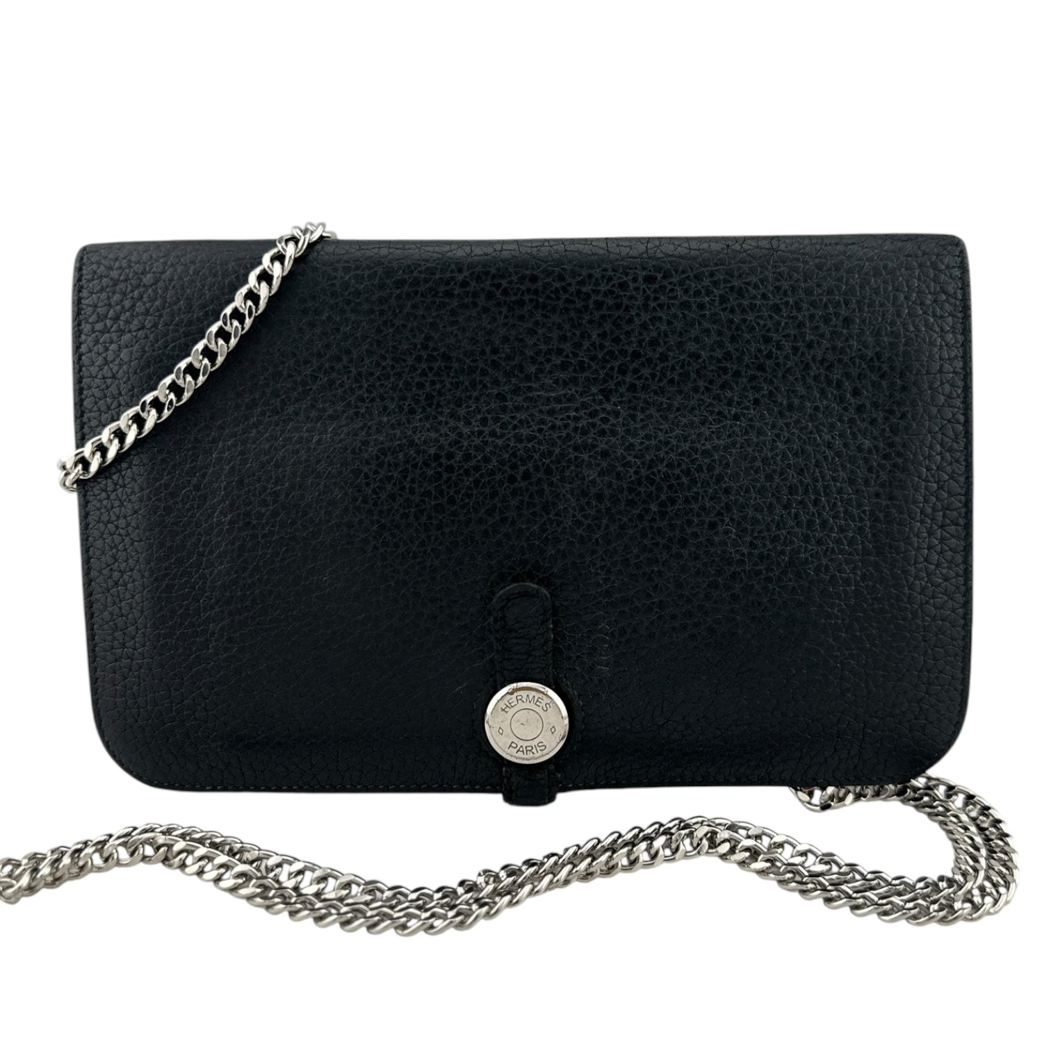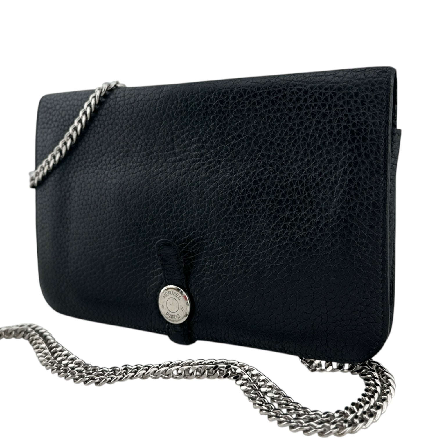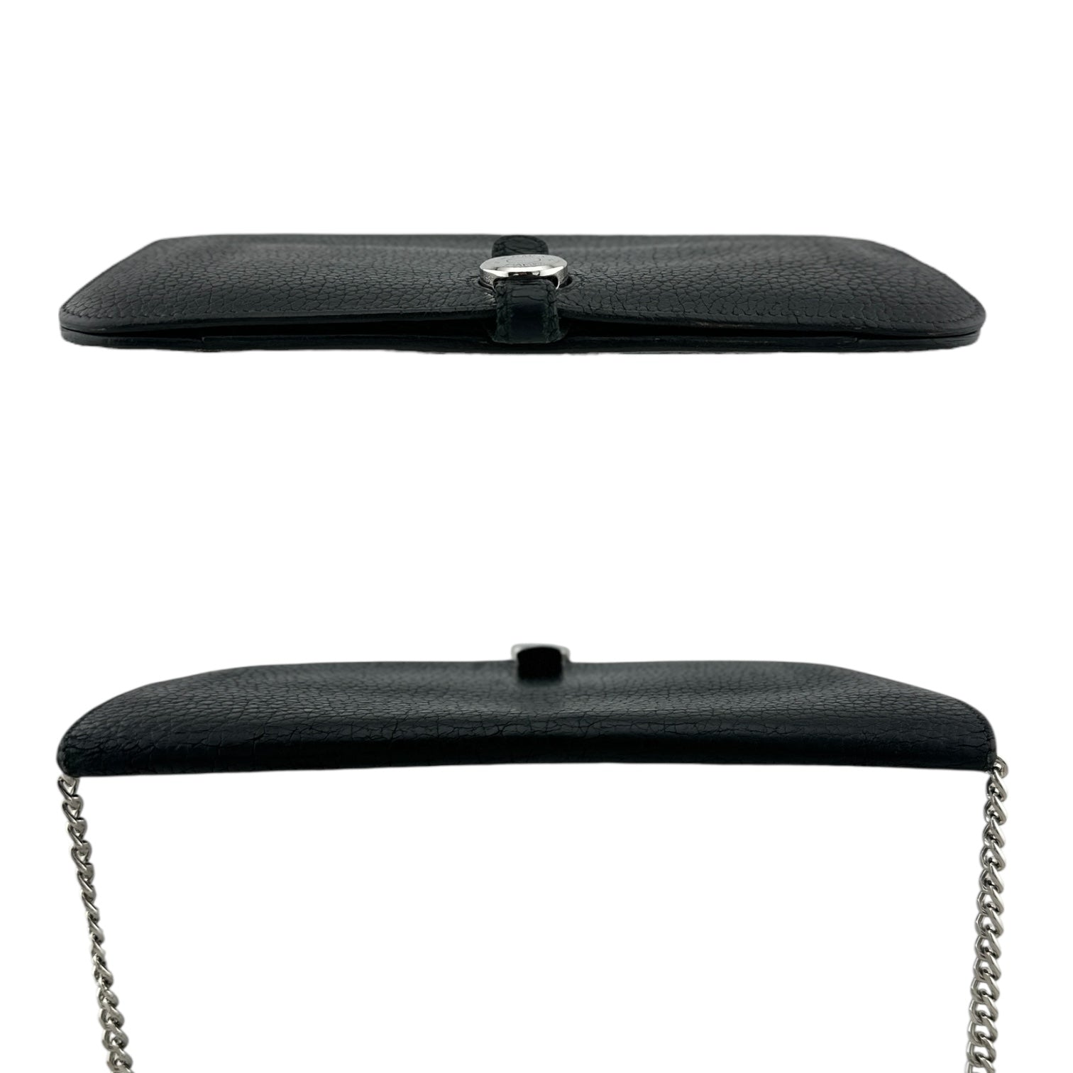 This pre-owned Hermes Blie Clemence Leather Dogon Wallet comes with an added unbranded crossbody chain, creating a versatile and stylish accessory.