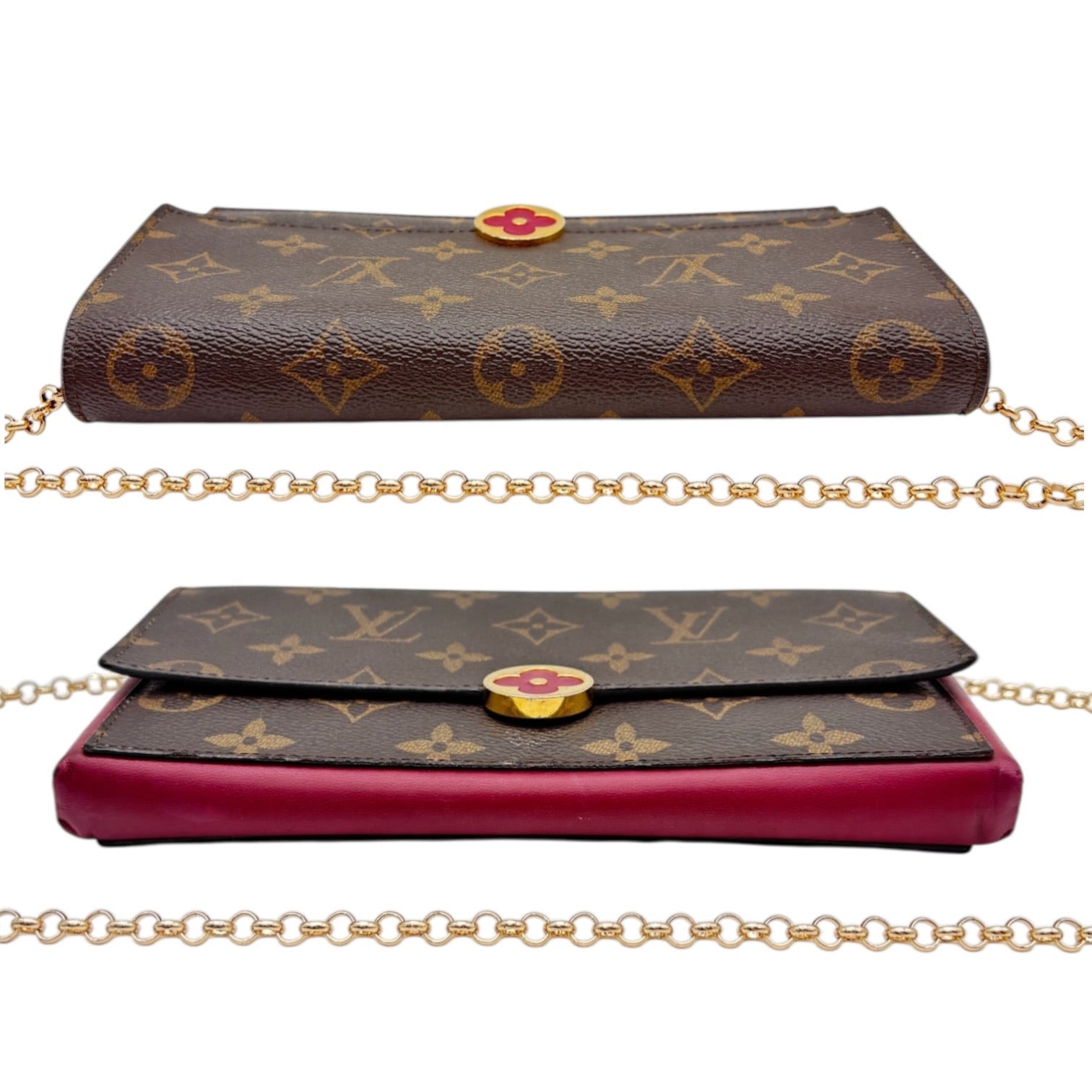 A bag as bright and cheery as the one who carries it! This beautiful authentic LOUIS VUITTON wallet features a hot pink flower motif and interior against the iconic LV monogram. We've added interior rings and a high quality detachable gold chain so it can be carried.