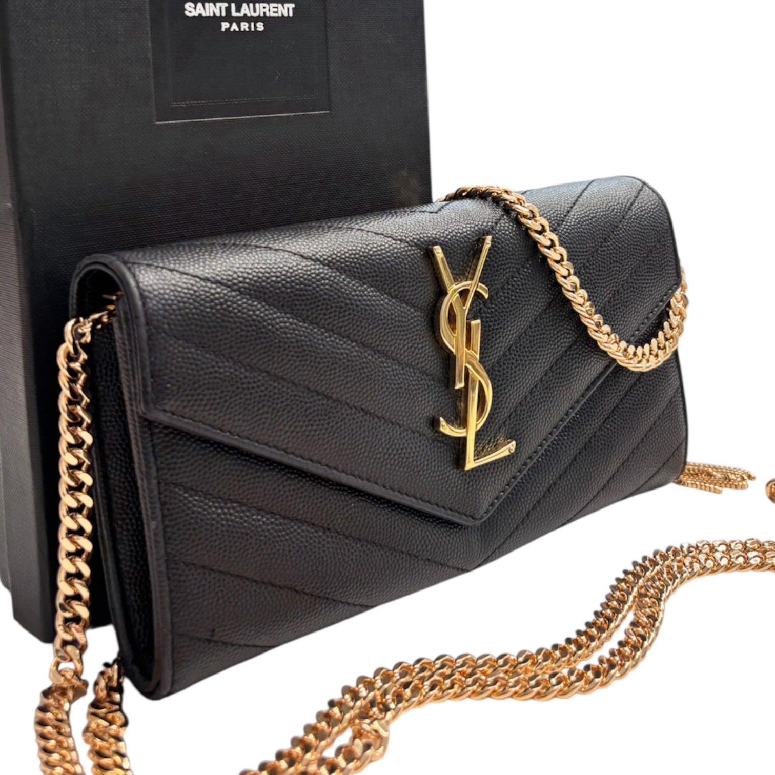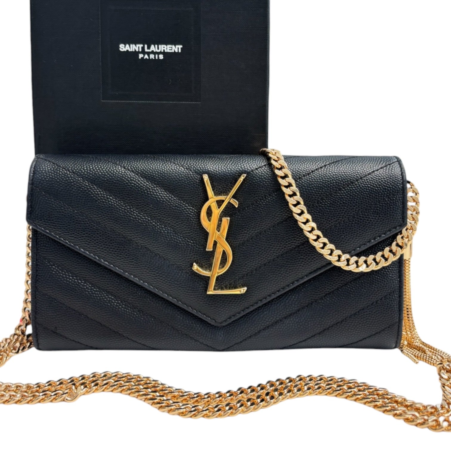 A beautiful SAINT LAURENT Cassandra Clutch in rich Grain de Poudre leather with large gold YSL logo. Added interior rings and high quality chain allow for crossbody or shoulder carry with chain doubled. Large enough to hold a phone, ID and card, its perfect for a night out.