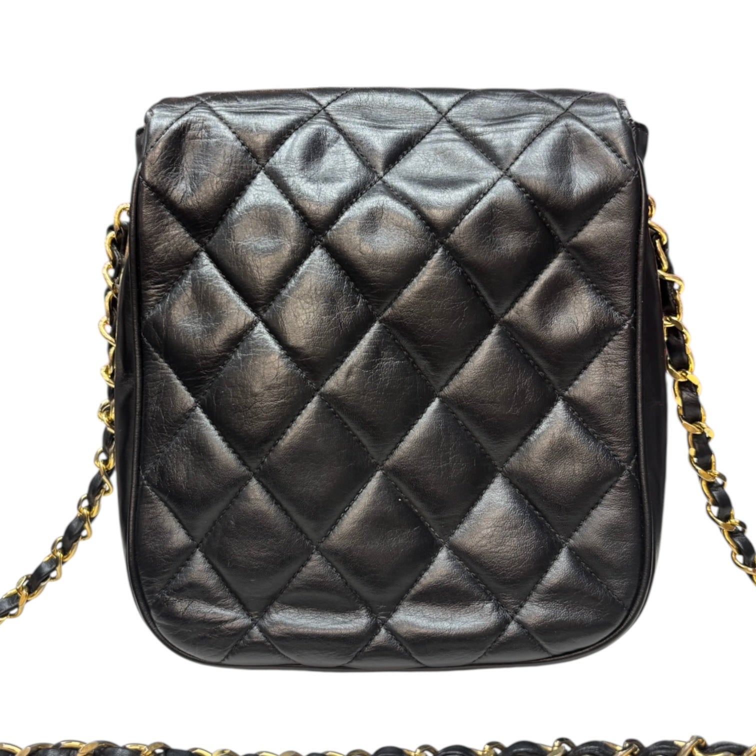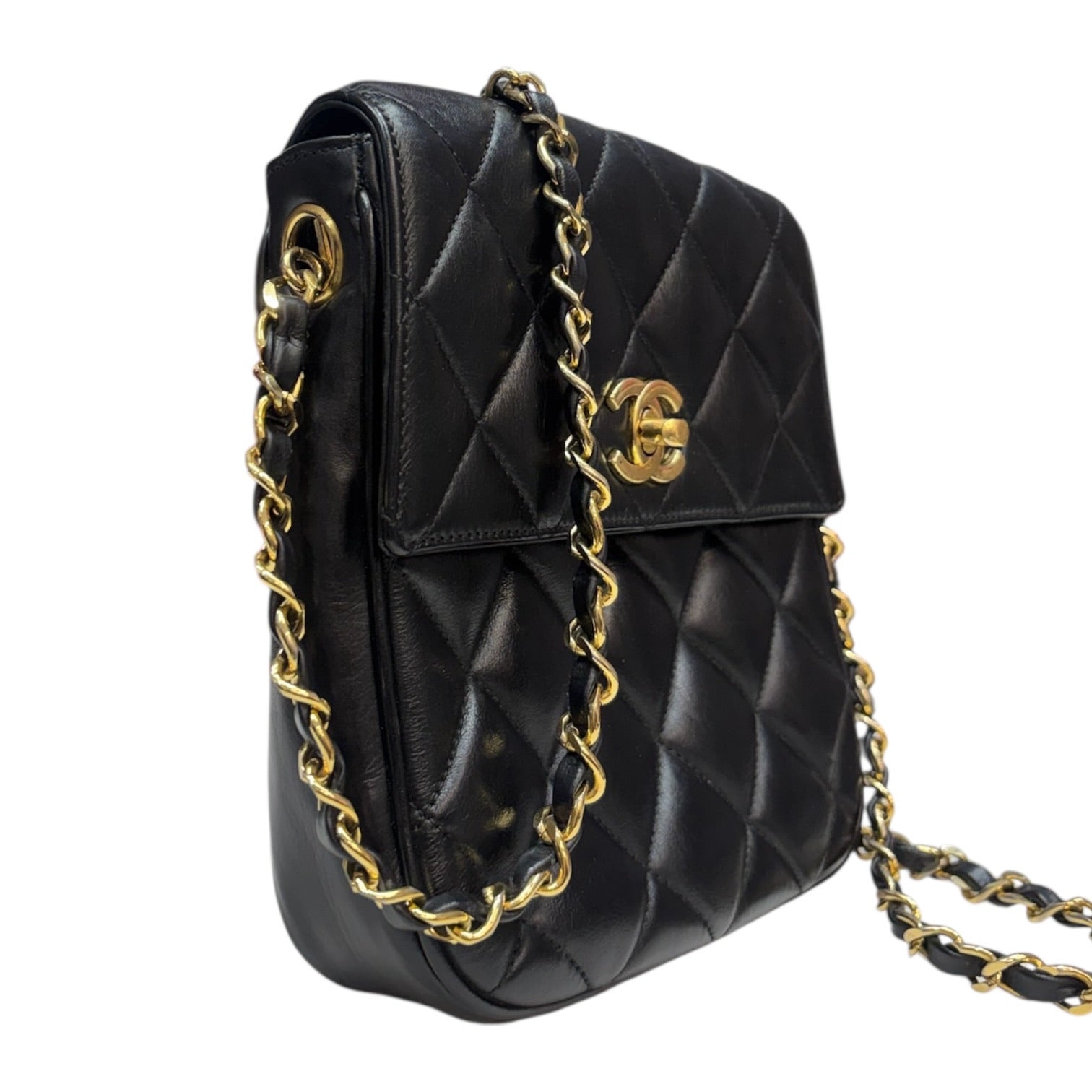 Vintage CHANEL Matelasse Chain Shoulder Bag with 24k gold hardware in black lambskin.